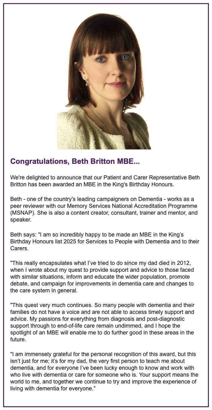 The Royal College of Psychiatrists (RCPSYCH) have kindly congratulated me on my MBE. I work for RCPSYCH as a Carer Rep for the Memory Services National Accreditation Programme (MSNAP).